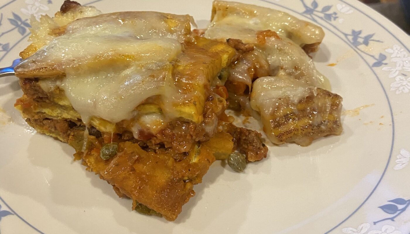 Assemble the pastelón: Cover the bottom of the casserole dish with a single layer of the fried plantain strips. Spoon a 1-inch layer of the ground beef mixture onto the plantains. Top with 1/2 cup of shredded cheese. Repeat with another layer of plantains, meat, and cheese (reserve the remaining 1 cup of cheese). Top with a final layer of plantains.