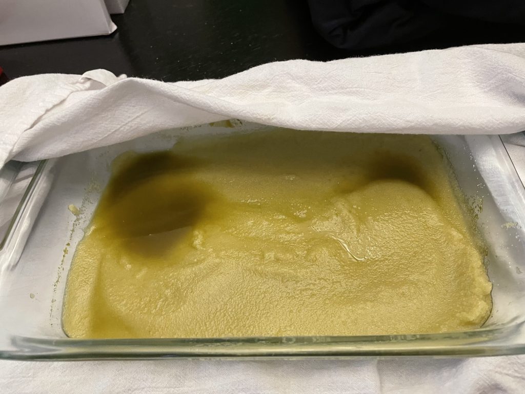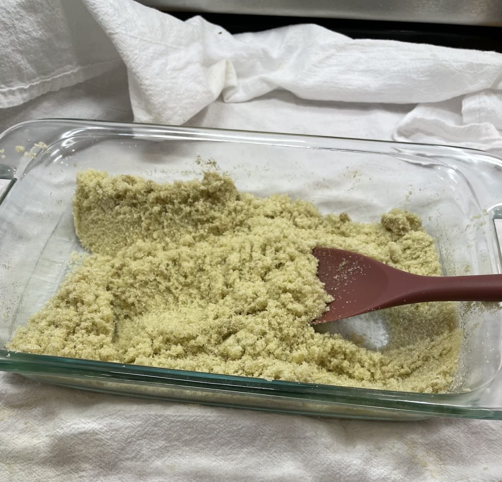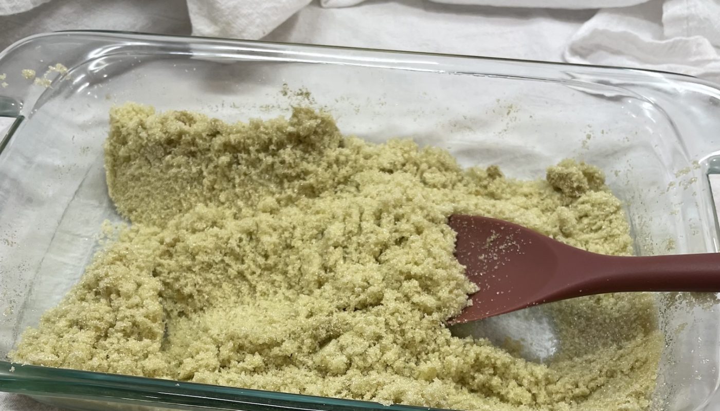 In a large glass baking pan, I use a 13×9. Add sugar and tincture and mix well. Cover it with a tea towel, make sure its not touching the sugar mixture. This will take 5-6 days for the alcohol to completely evaporate. Mix daily. The below picture is before it is completely evaporated.