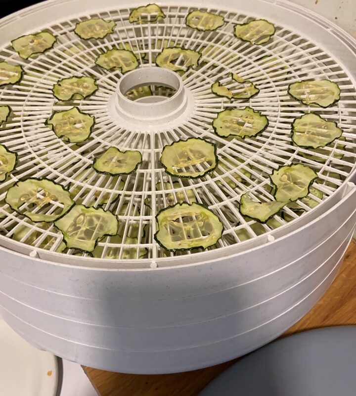 Slice cucumber very thin. Remove excess moisture from slices using a paper towel. Put cucumber slices in a large bowl and toss with oil, vinegar, and salt. For dehydrator: Place slices on trays and dry at 125-135°F for 10-12 hours or until crispy.For oven: Place slices on parchment lined baking tray. Dry at 175°F for 3-4 hours or until crispy. Allow to cool